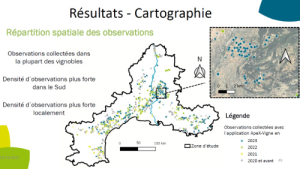 Le 13 novembre 2023, Léo Pichon (UMR ITAP) a présenté un travail de crowdsourcing en viticulture. La mise en commun d’observations géolocalisées avec l’application ApeX-Vigne permet de construire collectivement une cartographie régionale de l’état hydrique de la vigne.