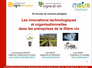 Le 23 mai 2023 s’est déroulé le septième épisode des « 60 minutes de sciences partagées ». Louis-Antoine Saïsset et Leïla Temri (UMR MoISA) ont présenté leur étude sur la caractérisation des innovations mises en œuvre dans les entreprises de la filière viti-vinicole pour faire face aux exigences de compétitivité, d’adaptation au changement climatique et de réduction de l’utilisation des produits phytosanitaires.