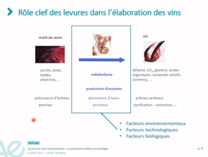 De nombreuses espèces de levure composent la flore indigène des moûts de raisin. Certaines d’entre-elles présentent des traits phénotypiques d’intérêt technologique. Le 6 juillet 2023, Carole Camarasa (UMR SPO) a présenté ses travaux sur la caractérisation des propriétés d’intérêt, les besoins nutritifs et le métabolisme de ces espèces pour une meilleure utilisation en vinification.